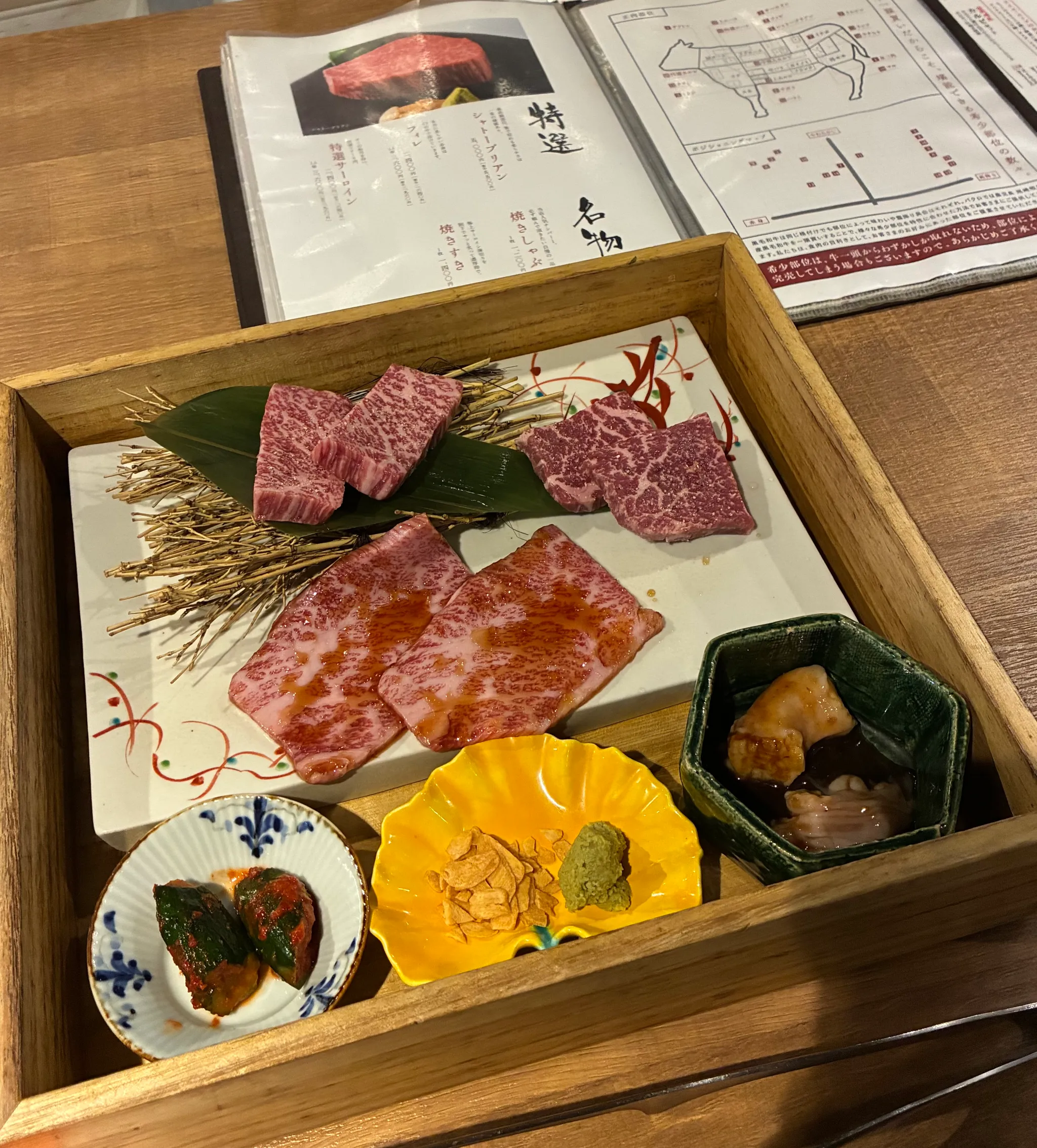 예약한 스테이크 전문점으로 향했다. 내부는 촘촘히 앉을 수 있는 바 테이블과 널찍한 테이블 두 개로 이뤄진 아담한 공간이었다. 고기는 100g 단위로 판매하고 있는데 다른 부위로 다양하게 주문해 보는 걸 추천한다. 점원이 같이 마실 음료를 물어본다. 이날 마셨던 주류는 ‘카쿠타마 플럼 와인’ 매실주다.